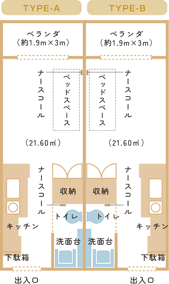 ただし、ご本人の配偶者、三親等内の親族、その他特別な事情によりご本人とともに入所していただくことが必要と認められる方については、年齢条件はありませんので、60歳未満の方も、60歳以上のご本人とご一緒に入所いただけます。ただし、二人部屋がありませんので、別々の個室になります。